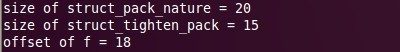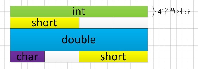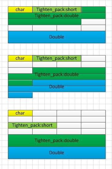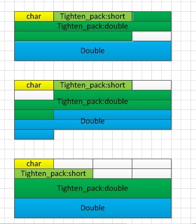 可以看出紧缩后结构体的大小为15,是结构体内置类型大小的和。 但是在默认情况下,结构体的大小都是对齐字节数的倍数。 ubuntu下pack只需要20个字节,而windows要24个字节。 这是因为ubuntu是以4字节对齐,而windows则是以最大的内置类型的字节数对齐,在结构体内最大的内置类型为double,其大小为8个字节。 他们在内存中的对齐方式如下图: